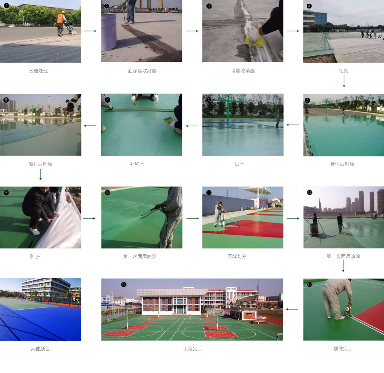 篮球场、网球场、羽毛球场:分二道,第一道加15%专用砂,第二道不加砂。篮球场三秒区分三道面层,第一、二加砂,第三道不加砂。排球场为二道不加砂。
