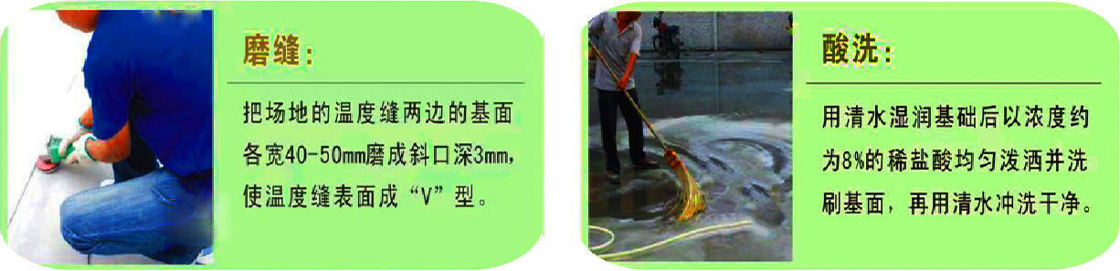 ①伸缩缝两边的基面磨成“V”型。以浓度为8%左右的稀盐酸均匀的泼洒并洗刷基面,再用清水必须冲洗干净在水洗过程中要圈出积水并做标识标记。
